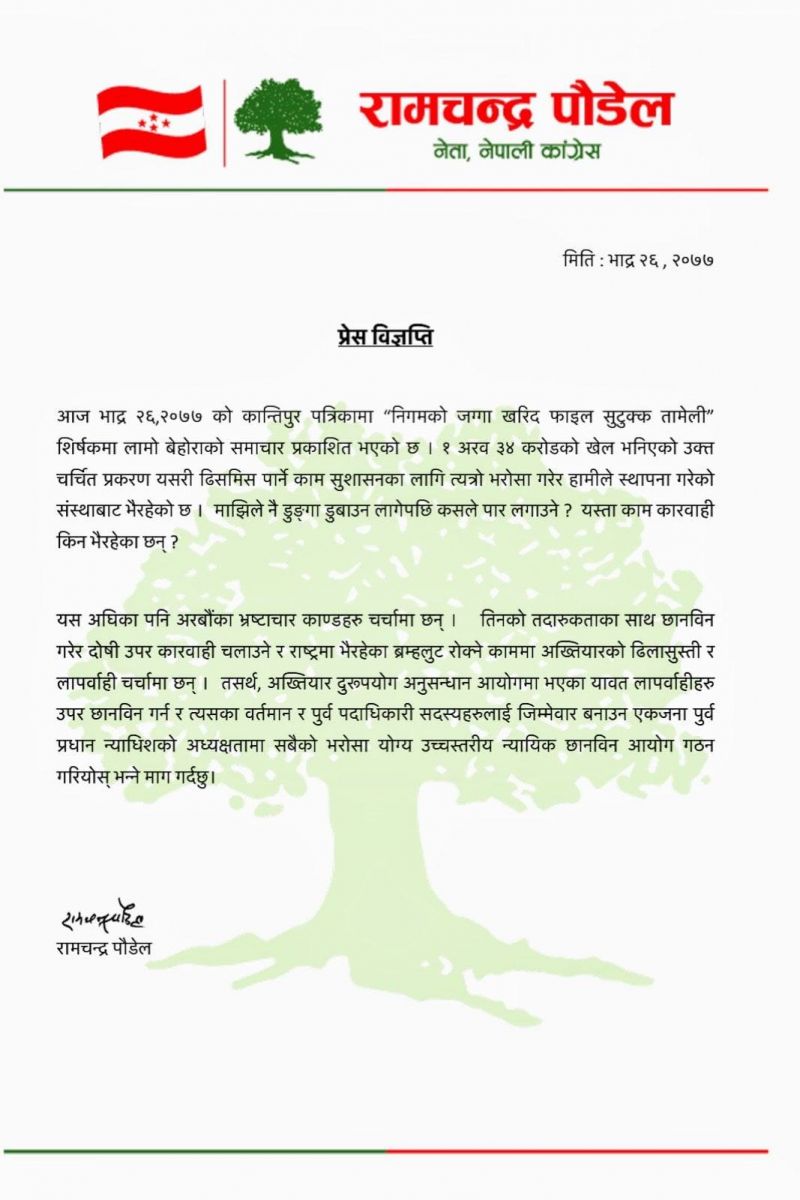 आयल निगमको जग्गा खरिद् प्रक्रियामा भएको अनियमितताको विषय तामेलीमा राखेको खबर सार्वजनिक भएपछि नेता पौडेलले विज्ञप्ति जारी गर्दै अख्तियार पदाधिकारीलाई कारबाहीको समेत माग गरेका छन्।
