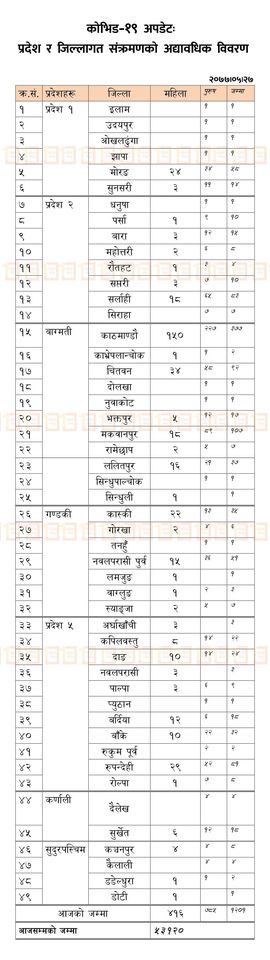 काठमाडौः पछिल्लो २४ घण्टामा ४९ जिल्लामा कोरोना भाइरसका नयाँ संक्रमित पहिचान भएका छन्। पछिल्लो २४ घण्टामा परीक्षण गरिएका १० हजार १७६ नमुना मध्ये ४१६ महिला र ७८५ पुरुष गरी एक हजार २०१ जनामा संक्रमण पहिचान भएको स्वास्थ्य तथा जनसंख्या मन्त्रालयका प्रवक्ता डाक्टर जागेश्वर गौतमले जानकारी दिए।