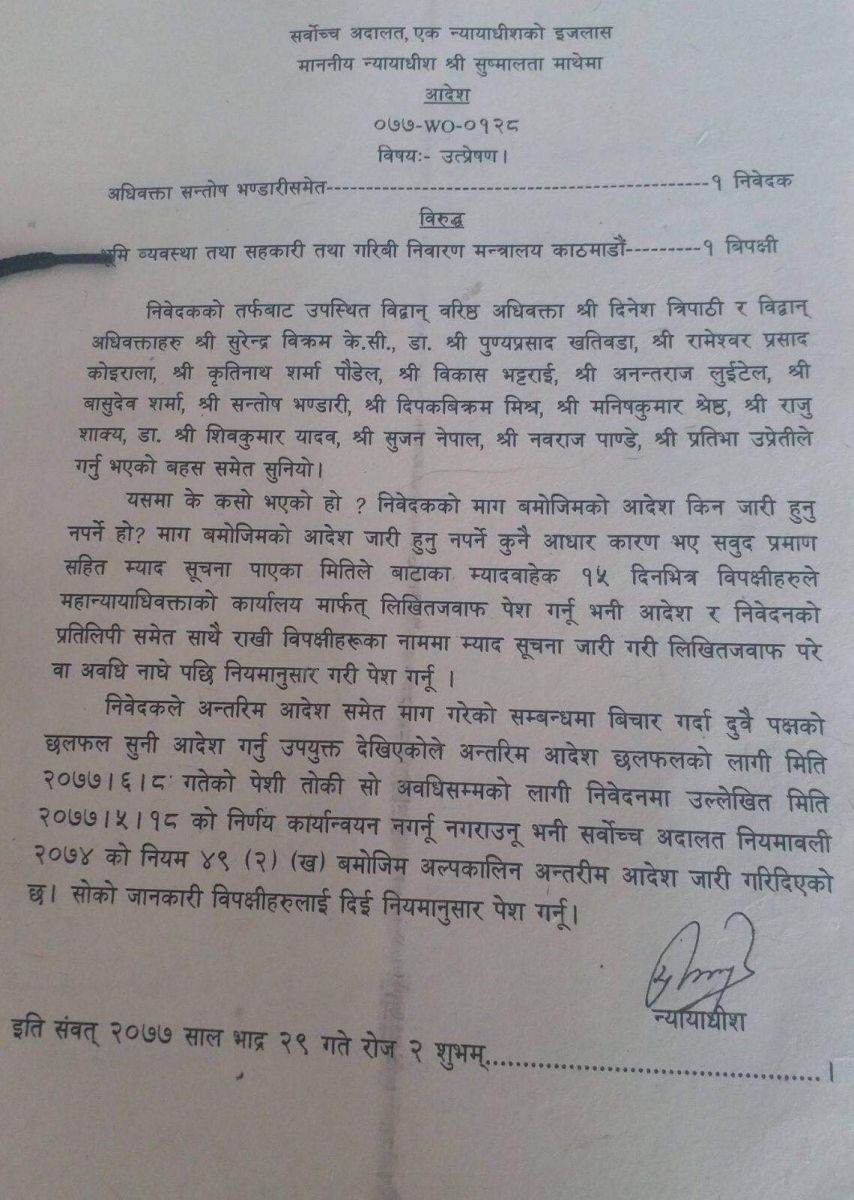 सर्वोच्चले अन्तरिम आदेश छलफलको लागि असोज ८ गतेको पेशी तोकेको छ। सो अवधिसम्मको लागि मन्त्रालयको भदौ १८ गतेको निर्णय कार्यान्वयन नगर्न नगराउन निर्देशन समेत दिएको हो।