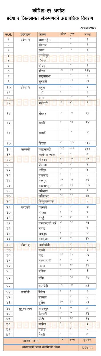काठमाडौं : पछिल्लो २४ घण्टामा ५२ जिल्लामा कोभिड-१९ का थप संक्रमित पहिचान भएका छन्। देशभरका प्रयोगशालाबाट गरिएको १० हजार ३७५ नमुना परीक्षणका क्रममा महिला ४४६ र एक हजार १३ पुरुष गरी एक हजार ४५९ जना संक्रमित पहिचान भए छन्।