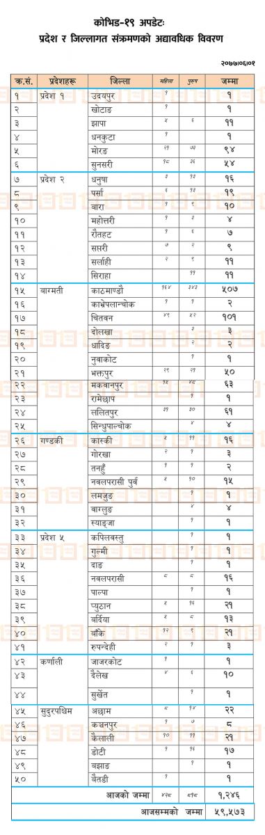त्यस्तै प्रदेश १ मा १६२ जना नयाँ संक्रमित पहिचान भएका छन्। जसमध्ये मोरङका ९४ जना छन्। मोरङमा २१ महिला र ७३ पुरुषमा संक्रमण पुष्टि हुँदा सुनसरीमा १८ महिला र ३६ पुरुष गरी ५४ जनामा संक्रमण पुष्टि भएको छ।