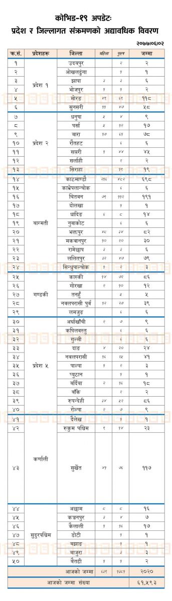 काठमाडौं : पछिल्लो २४ घण्टामा ५० जिल्लामा कोभिड-१९ का संक्रमित पहिचान भएका छन्। देशभरका प्रयोगशालामा गरिएको ११ हजार ४५८ नमुना परीक्षणका क्रममा ६३९ महिला र एक हजार ३८१ पुरुष गरी दुई हजार २० जनामा कोभिड-१९ को संक्रमण पुष्टि भएको स्वास्थ्य तथा जनसंख्या मन्त्रालयका प्रवक्ता डाक्टर जागेश्वर गौतमले जानकारी दिए।