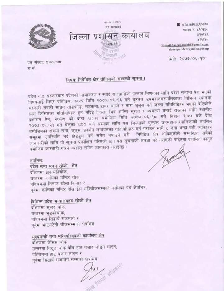 काठमाडौँः प्रदेशको राजधानी तथा नामकरण विवादमा प्रदर्शन बढेपछि जिल्ला प्रशासन कार्यालय रुपन्देहीले बुटवल उपमहानगरपालिकाका केही भागलाई निषेधित क्षेत्र तोकेको छ। असोज १८ गते (भोलि) देखि लागू हुनेगरि असोज २१ गतेसम्म केही स्थान निषेधित क्षेत्र तोकिएको हो।