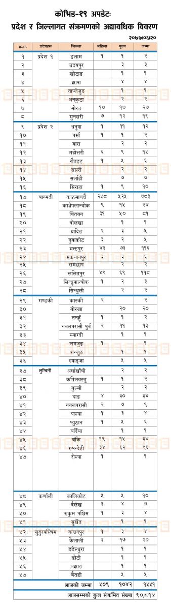 त्यस्तै प्रदेश १ मा ६९, प्रदेश ३ मा ५६ र गण्डकीमा ४५ जना संक्रमित पहिचान भएका छन्।