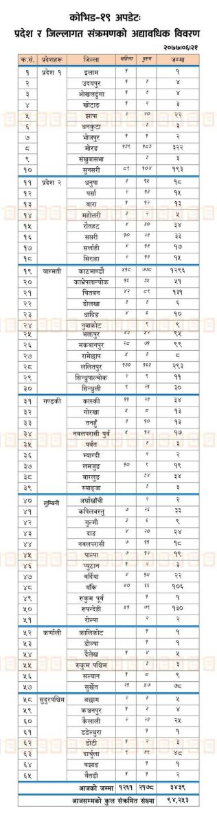 त्यस्तै, प्रदेश २ का ८ वटै जिल्लामा १५० जनामा संक्रमण पुष्टि भएको छ भने गण्डकीका ९ जिल्लामा १३८ जनामा संक्रमण पुष्टि भएको तथ्यांकमा उल्लेख छ।