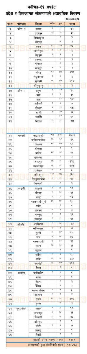 त्यस्तै प्रदेश २ मा १६५, कर्णालीमा १३७ र सुदुरपश्चिममा ११६ जनामा संक्रमण पुष्टि भएको छ। त्यस्तै गण्डकी प्रदेशमा ९७ जनामा संक्रमण पुष्टि भएको छ।