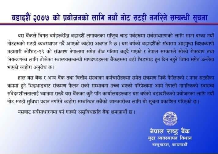 काठमाडौँः कोरोना संक्रमण तीव्र गतिमा फैलिरहेको भन्दै नेपाल राष्ट्र बैंकले यो वर्ष दशैँका लागि नयाँ नोटको सटही नगर्ने भएको छ। नोट सटहीले सरकारले तोकेको स्वास्थ्य मापदण्ड विपरीत भीडभाड हुनदे भन्दै केन्द्रीय बैंकले नोट नसाट्ने सूचना जारी गरेको हो।