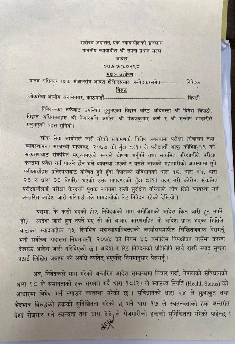 काठमाडौँः सर्वोच्च अदालतले कोरोना संक्रमितले परीक्षा दिन नपाउने गरी लोक सेवा आयोगले तयार पारेको परीक्षा सञ्चालन सम्बन्धी मापदण्ड कार्यान्वयन नगर्न अन्तरिम आदेश जारी गरेको छ। मानव अधिकार रक्षक सञ्जालका तर्फबाट दायर रिटमा न्यायाधीश सपना प्रधान मल्लको एकल इजलासले मापदण्ड संविधानले प्रत्याभूत गरेको मौलिक अधिकार विपरीत भएको समेत आदेशमा उल्लेखमा गरेको छ।