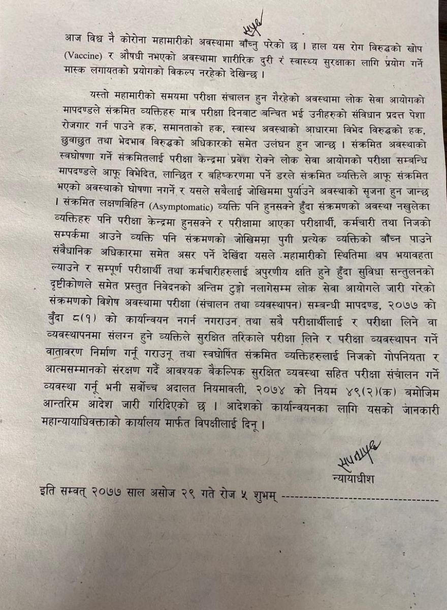 अदालतले स्वास्थ्य मापदण्ड परिपालना गरेर परीक्षा लिन र सोही अनुसार व्यवस्थापन गर्न पनि आदेशमा भनेको छ।