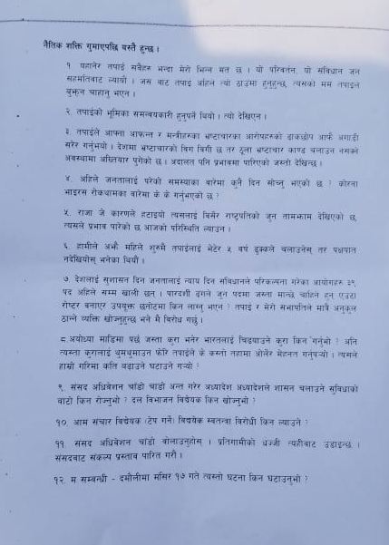 उनले प्रश्न गरे, ‘अहिले जनतालाई परेको समस्याका बारेमा कुनै दिन सोच्नु भएको छ? कोरोना भाइरस रोकथामका बारेमा के के गर्नुभएको छ?’