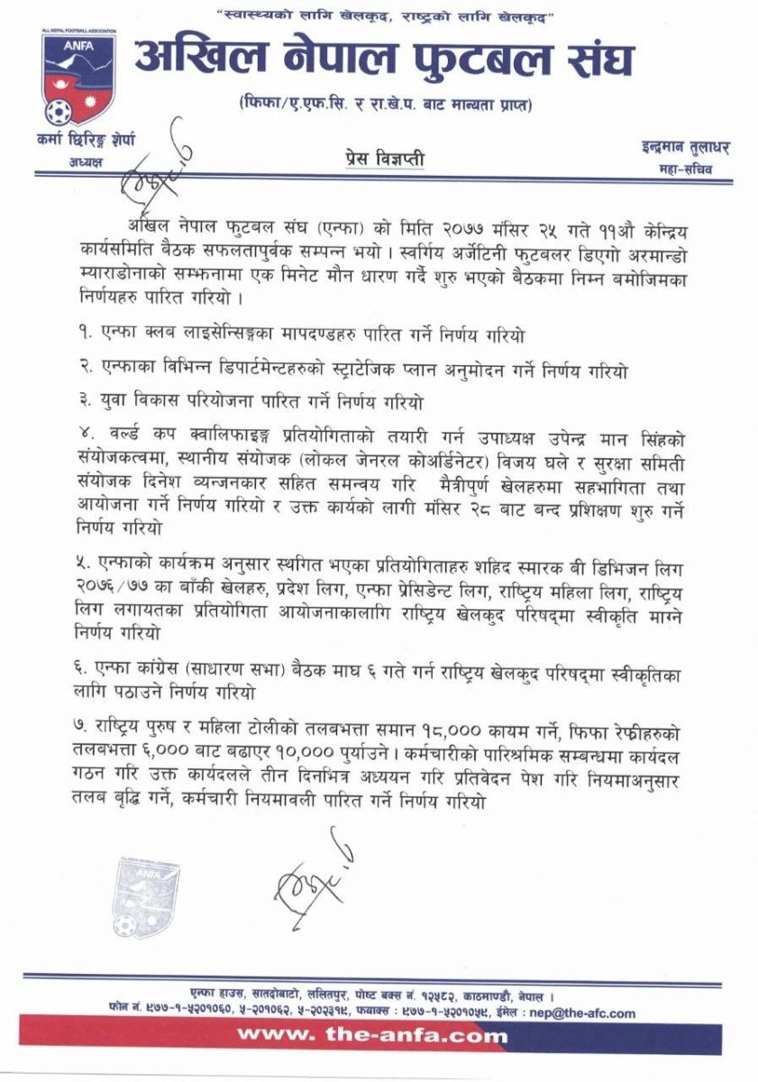 ‘राष्ट्रिय पुरुष तथा महिला टोलीको तलबभत्ता समान १८ हजार कायम गर्ने, फिफा रेफ्रीहरुको तलबभत्ता ६ हजारबाट बढाएर १० हजार पुर्याउने,’ एन्फाले जारी गरेको विज्ञप्तिमा भनिएको छ।