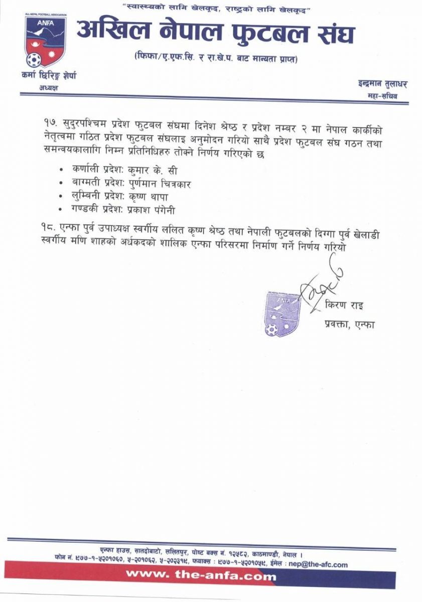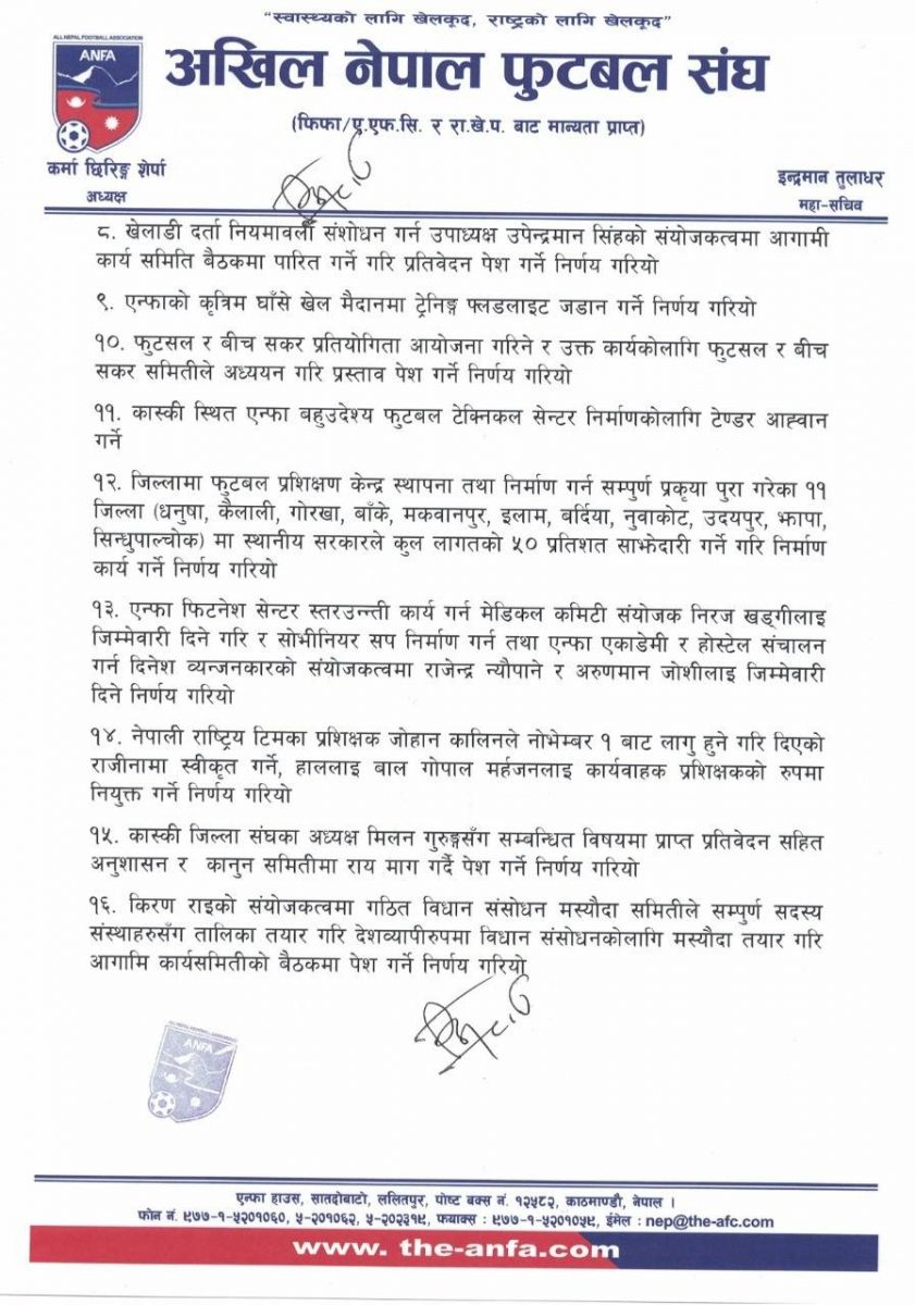 त्यस्तै, बैठकले फुटबलका मुख्य प्रशिक्षक योहान कालिनको राजीनामा स्वीकृत गर्नेदेखि बी डिभिजन लिग लगायतका प्रतियोगिता आयोजनाका लागि राष्ट्रिय खेलकुद परिषदमा स्वीकृतिका लागि पठाउन लगायतका १८ वटा निर्णय गरेको छ।