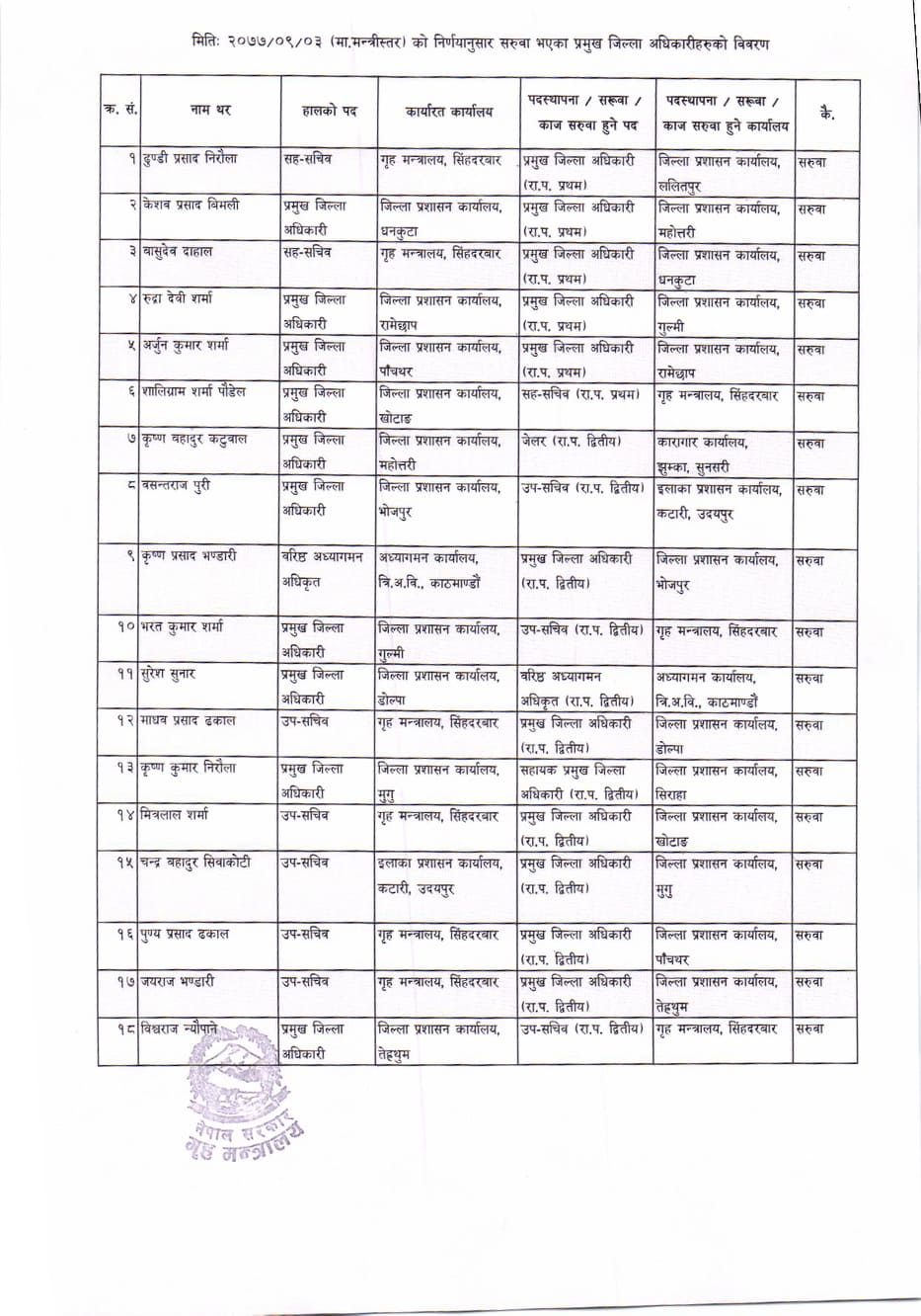 शुक्रवार गृहमन्त्रालयमा बसेको मन्त्रीस्तरीय बैठकले सिडओको सरुवा गरेको हो। ललितपुर, गुल्मी, तेह्रथुम, उदयपुर, रामेछाप लगायत जिल्लाहरुमा प्रमुख जिल्ला अधिकारीको सरुवा गरिएको छ। ललितपुरमा सहसचिव ढुण्डी प्रसाद निरौलालाई सरुवा गरिएको छ। उनी यसअघि गृहमन्त्रालयमा कार्यरत थिए।