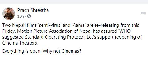 सिनेमाहलहरू खुल्नु केही प्रदर्शक, केही वितरक र केही निर्माताहरू मात्र स्वार्थसँग जोडिएको विषय नभएको बताउँछन् फिल्मकर्मी प्रचण्डमान श्रेष्ठ। उनले हल खुल्दैमा तुरुन्तै आर्थिक गतिविधि पुरानै लयमा नफर्किने जनाउँदै लेखेका छन्,'केही समयका लागि प्रदर्शक र वितरकहरूलाई थप आर्थिक भार पर्न पनि सक्छ। तर, हलहरु खुल्दा जाने सकारात्मक संदेशले यस क्षेत्रमा आश्रित हजारौँ कामदार, प्राविधिक, कलाकार र चलचित्रकर्मीहरूलाई उर्जा मिल्छ।'