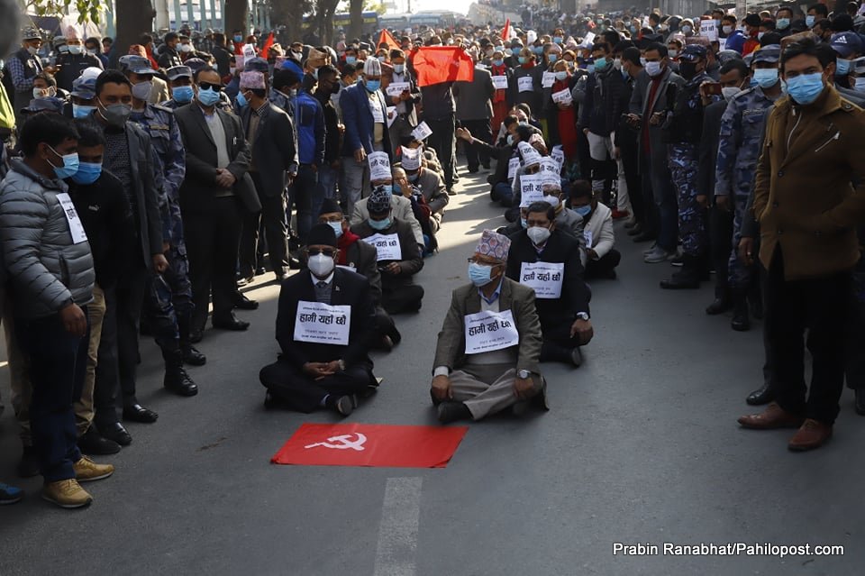 'हामी यहाँ छौं' भन्ने नारासहितको प्लेकार्ड भिरेर नेकपाका अध्यक्ष पुष्पकमल दाहाल 'प्रचण्ड', अर्का अध्यक्ष माधव कुमार नेपाल, वरिष्ठ नेता झलनाथ खनाल, प्रवक्ता नारायणकाजी श्रेष्ठसहितका नेताहरु सडकमा माइतीघरमा सडकमा पलेँटी कसेर बसेका छन्।