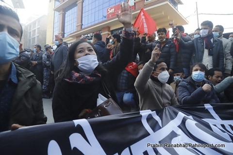 काठमाडौं : प्रतिनिधिसभा विघटनको विरोधमा नेपाल कम्युनिस्ट पार्टी (नेकपा)को प्रचण्ड-माधव नेपाल समूह सडकमा उत्रिएको छ। बिहीवार सम्पन्न केन्द्रीय कमिटीको बैठकको निर्णय अनुसार नेकपाको यो समूह आज देखि सडकमा उत्रिएको हो।