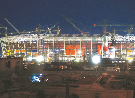 निर्माणको अवस्था : यो स्टेडियममा ९९८ कन्टेनरको प्रयोग गरेर बनाइरहेको छ जसमा कन्टेनर ल्याउने र जोड्ने काम सम्पन्न भइसकेको छ।