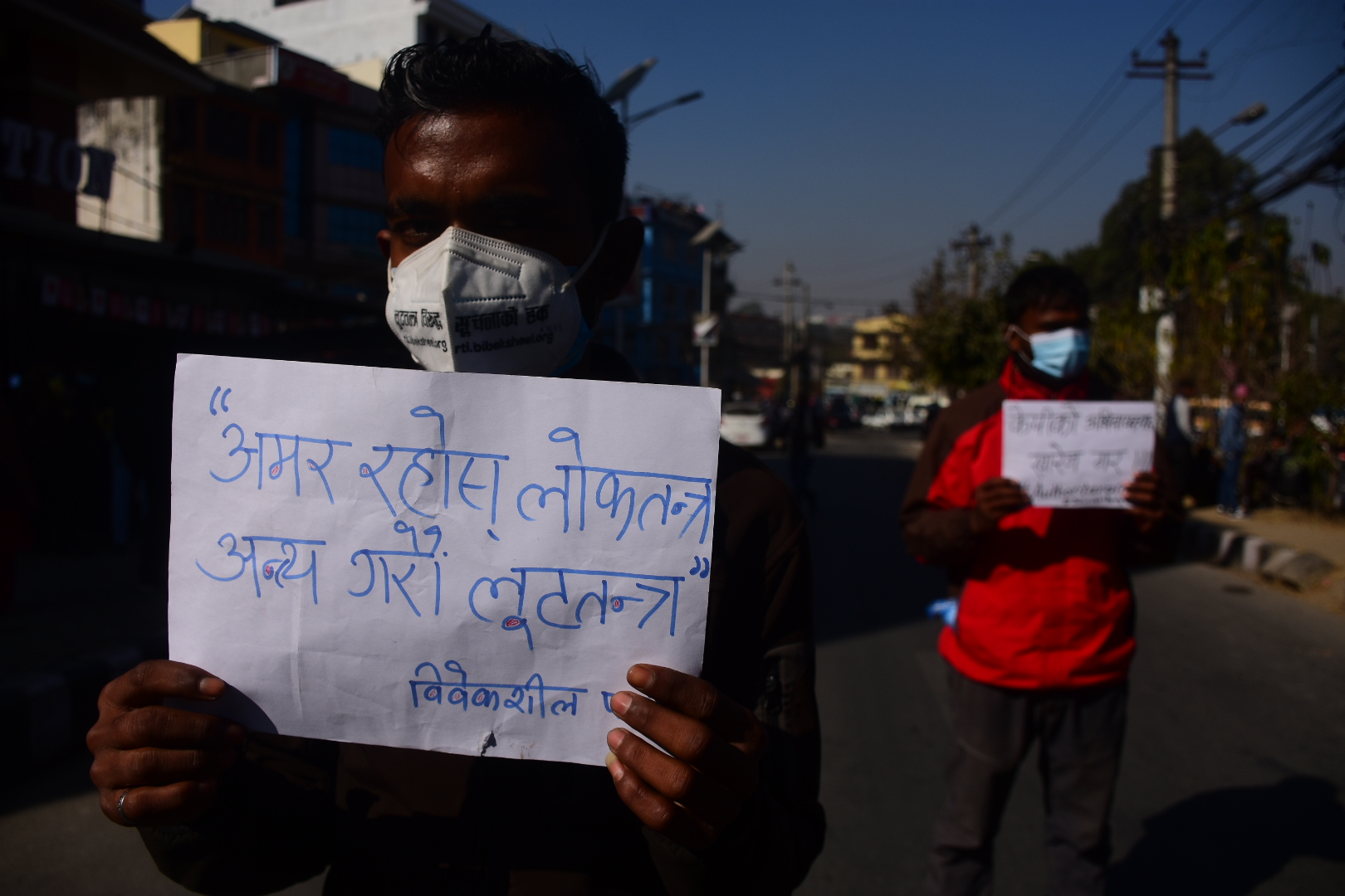 काठमाडौं : विवेकशील पार्टीले आज प्रधानमन्त्री केपी शर्मा ओलीको प्रतिनिधिसभा विघटनको विरुद्ध प्रदर्शन गरेको छ। उनीहरुले प्ले कार्डमा ओलीको कदमको भत्सर्ना गर्दै सिर्जनात्मक प्रदर्शन गरेका हुन्।