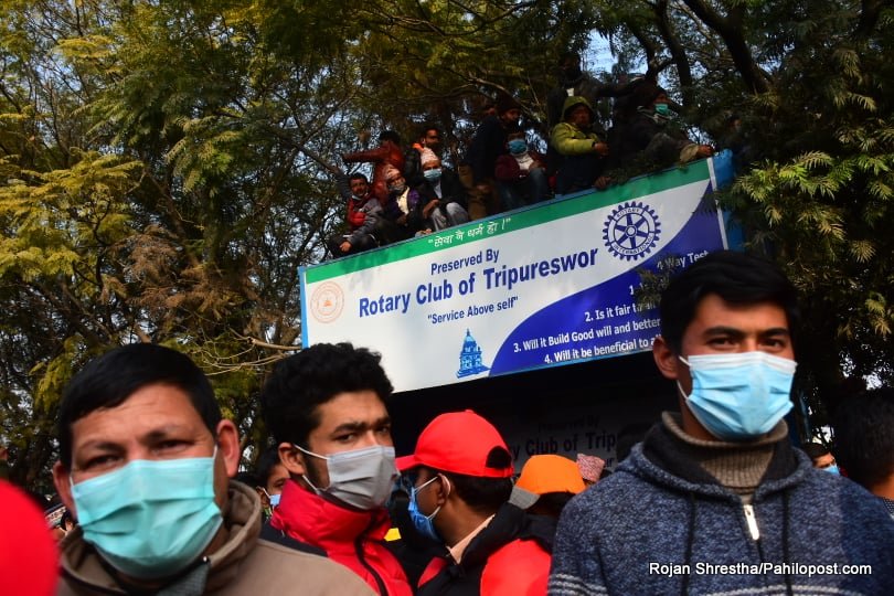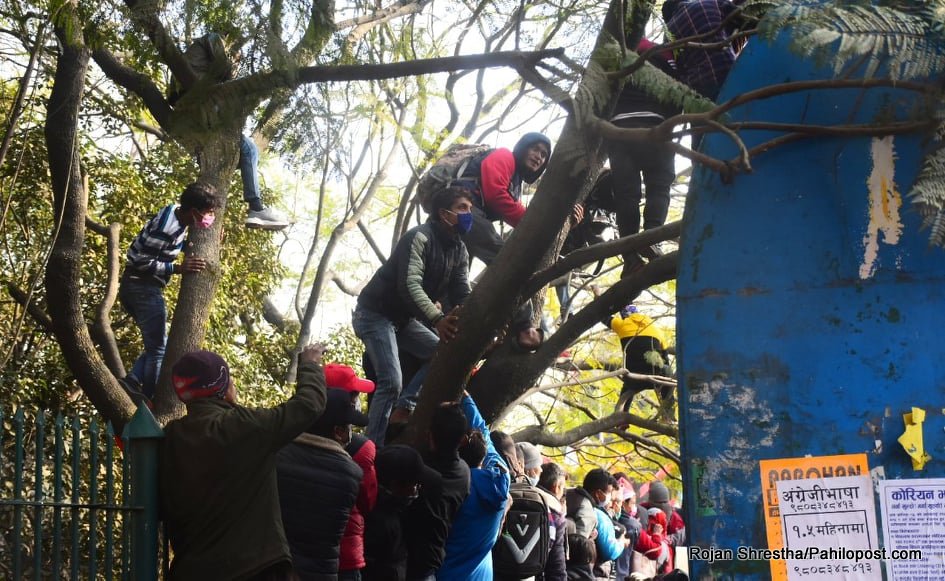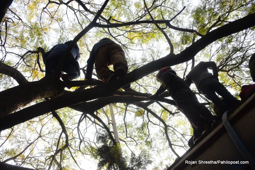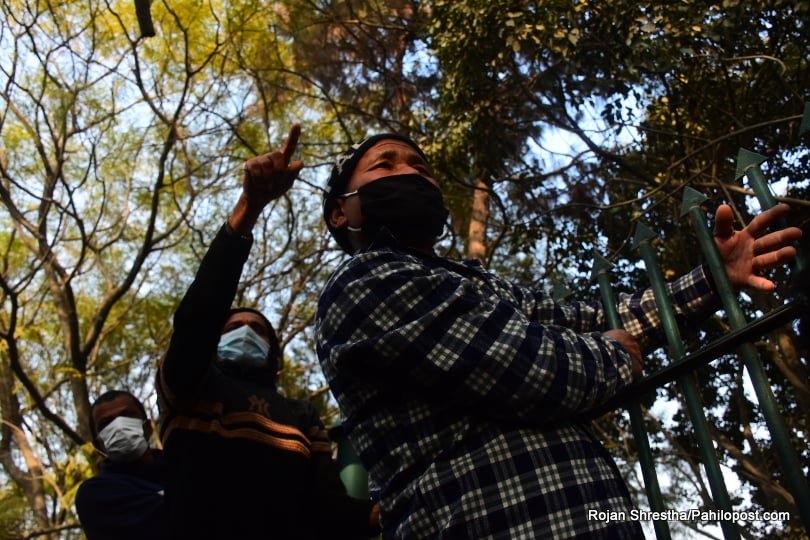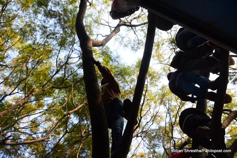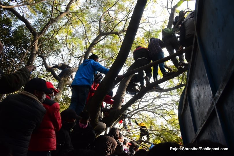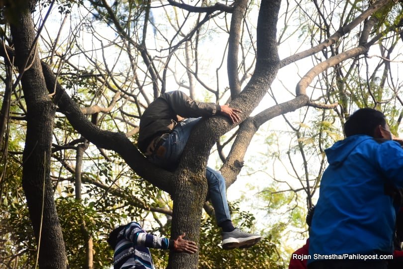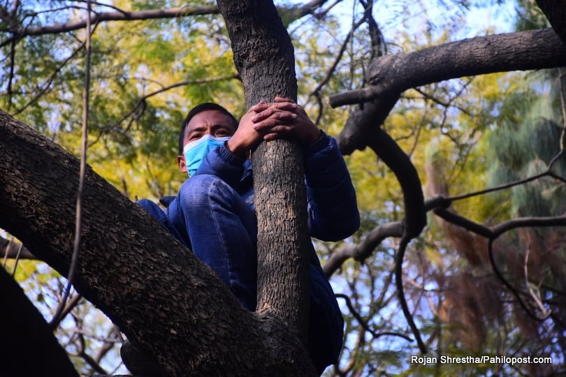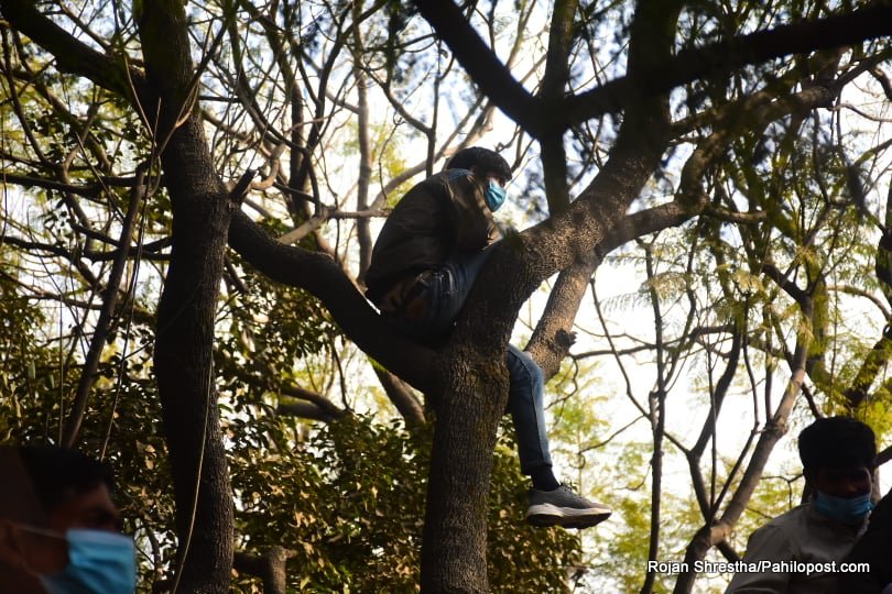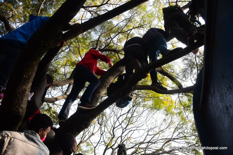 त्यसैले हुनुपर्छ यो आन्दोलनमा नेतालाई मञ्चमा हेर्नेहरुले बैकल्पिक बाटो रोजे। उनीहरु वरपर रहेका रुखमा उक्लिन थाले। धेरैपछि राजधानीका रुखमा यसरी मानिसहरु चढेको देखियो। आन्दोलनको यो कार्यक्रममा उनीहरु जोखिम मोलेरै भए पनि रुखमा उक्लिएका थिए। हेर्नुस् दृष्यहरु :