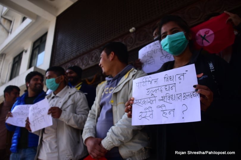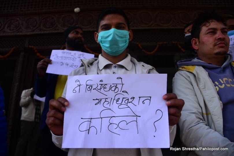 आज सभापति देउवालाई आफ्नै कार्यकर्ताले प्लेकार्ड देखाउँदै प्रश्न गरेका हुन्। पार्टीको विधान नचिन्नेले संविधान नचिन्ने, देश नचिन्नेले पार्टी चिन्दैन भन्दै उनको आलोचना गरेका थिए।