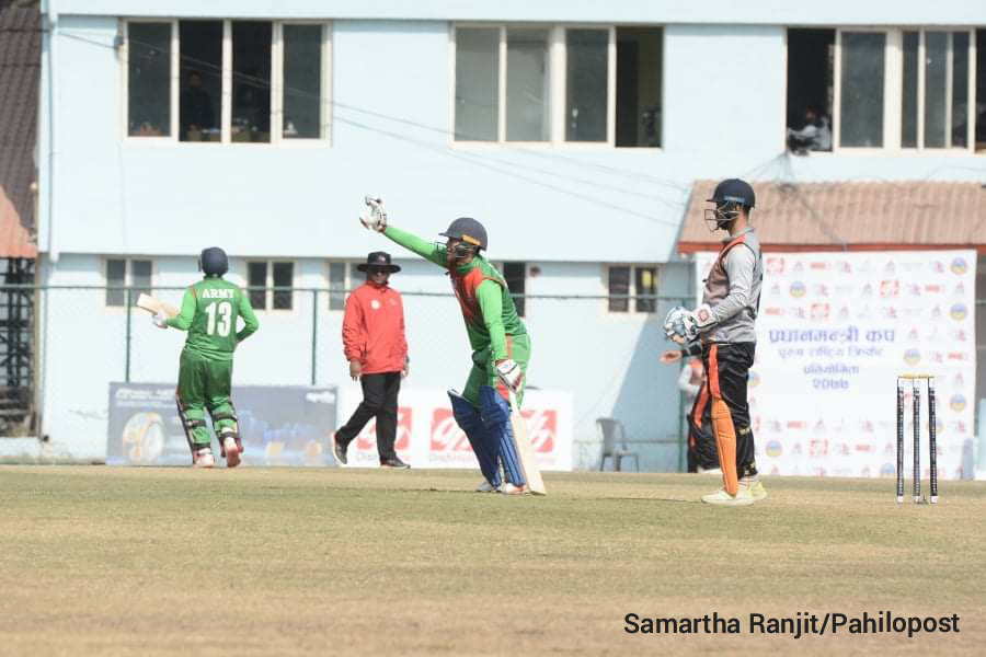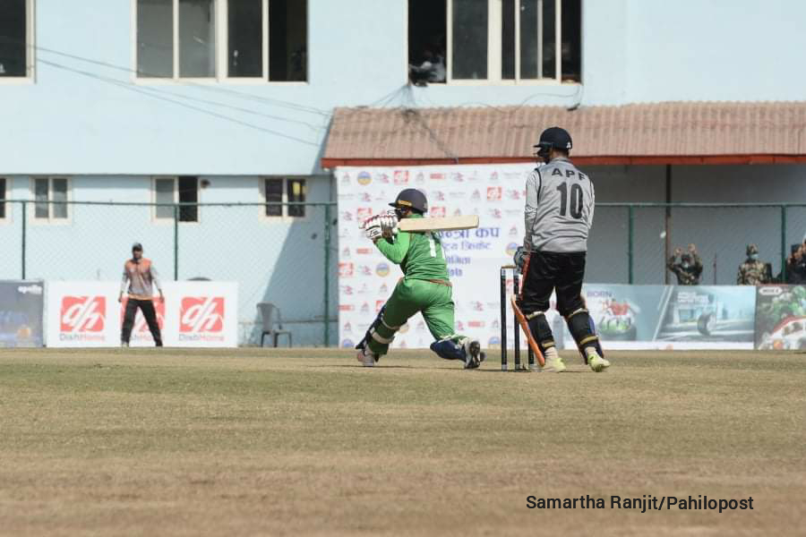 आर्मीका लागि हरि चौहानले सर्वाधिक ५८ रन बनाउँदा राजेश पुलामीले २८ रन जोडे। त्यस्तै सहाब आलमले २५ रन बनाउँदा लोकेस बमले १५ रन बनाँदा सुशन भारी र रोहित पौडेलले समान १३/१३ रन जोडे।