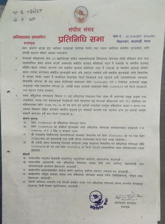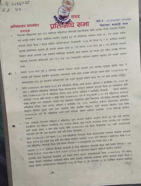 सभामुखले सूचना समयमा नदिएको भन्दै संवैधानिक परिषदको बैठकमा अनुपस्थिति जनाएपछि साँझ अध्यादेश र सिफारिस भएको थियो। विभिन्न ११ संवैधानिक निकायमा रिक्त रहका पदमा केपी ओलीले आफ्ना पक्षका मानिसहरु सिफारिस गरेका थिए।