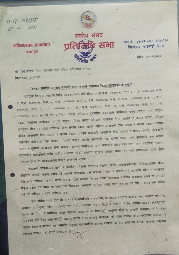 काठमाडौं : सभामुख अग्नि सापकोटाले संवैधानिक परिषदबाट भएका ३८ वटै नियुक्ति फिर्ता गरेका छन्। मुख्य सचिवलाई पत्राचार गर्दै सभामुख सापकोटाले पुस ५ गते प्रतिनिधिसभा विघटन भएकाले संसदीय सुनुवाई गर्न नसकिने लगायतका कारणहरु देखाउँदै नियुक्तिको सिफारिस फिर्ता गरेका हुन्। संवैधानिक निकायहरुमा नियुक्तिका लागि गरिएको सिफारिसको संसदीय सुनुवाईका लागि सभामुखलाई पत्राचार भएको थियो।