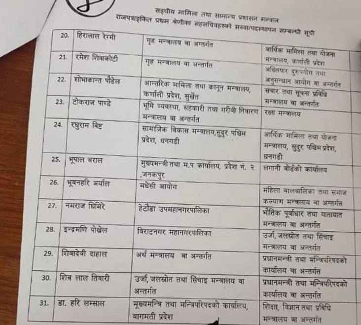 काठमाडौं : सरकारले सहसचिवहरुको सरुवा गरेको छ। मन्त्रिपरिषद् बैठकबाट ३१ जना सहसचिवहरुको सरुवाको निर्णय भएको हो।
