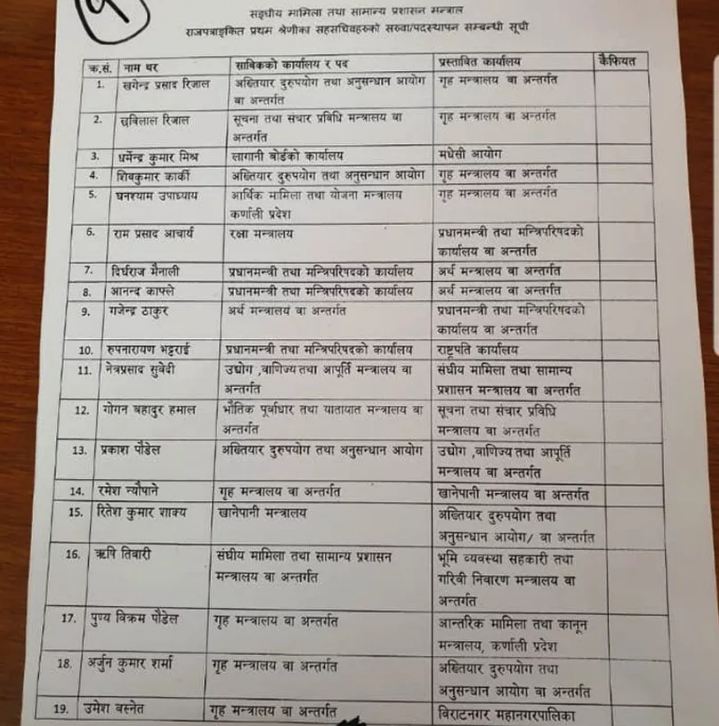 अख्तियार दुरुपयोग अनुसन्धान आयोगका खगेन्द्र प्रसाद रिजाल र शिवकुमार कार्कीलाई सरकारले गृह मन्त्रालय पुर्याएको छ। गृहका अर्जुन कुमार शर्मा र रमेश शिवाकोटीलाई अख्तियारमा लगिएको छ।