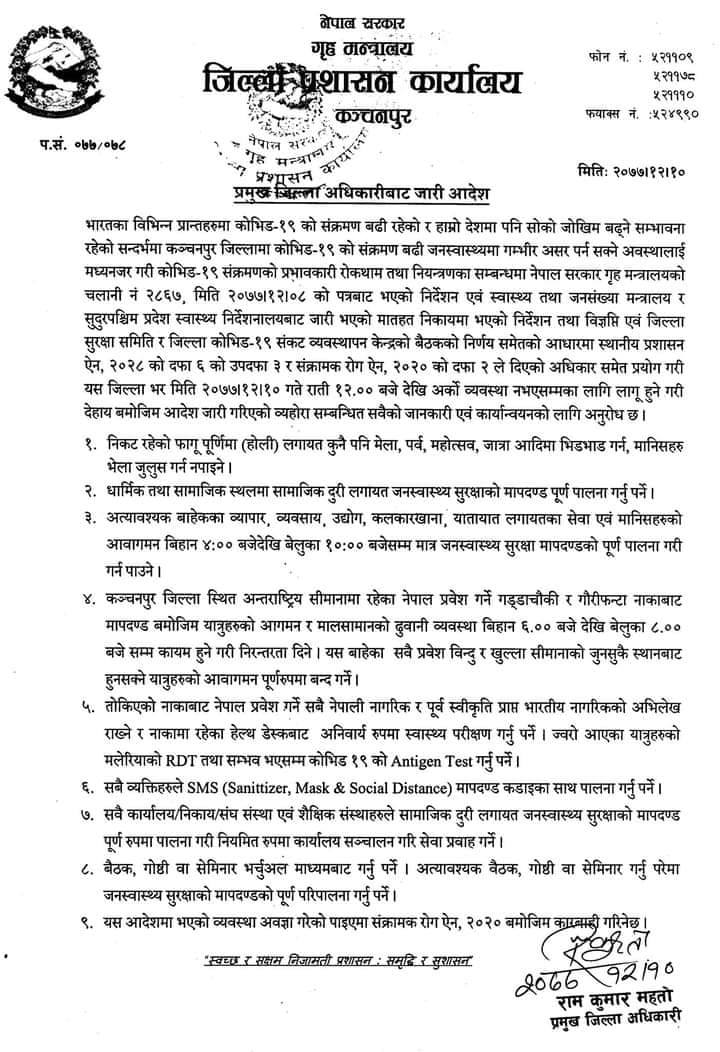 गृह मन्त्रालयको निर्देशन एवं स्वास्थ्य तथा जनसंख्या मन्त्रालय र सुदुरपश्चिम प्रदेश स्वास्थ्य निर्देशनालयबाट जारी भएको निर्देशन र जिल्ला सुरक्षा समिति तथा जिल्ला कोभिड-१९ संकट व्यवस्थापन केन्द्रको बैठकको निर्णयको आधारमा आज राति १२ बजेदेखि अर्को व्यवस्था नभएसम्मका लागि प्रशासनले उक्त आदेश जारी गरेको छ।