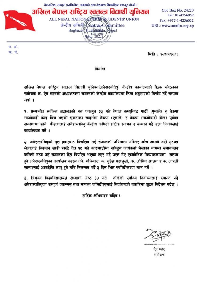 'अनेरास्ववियुको मुल प्रबाहबाट विचलित भई संगठनको गरिमामा गम्भिर आँच आउने गरी गुटगत भेलालाई निरन्तर जारी राख्दै चैत्र १० गते काठमाडौमा राष्ट्रिय कार्यकर्ता भेलाका नाममा समानान्तर कमिटी गठन गर्नु संगठनको हित विपरित भएको ठहर गर्दै उक्त गैर राजनैतिक क्रियाकलापमा संलग्न हुने अनेरास्ववियुका सचिवहरुः सुदेश पराजुली, ओसिम आलम र आरती लामालाई आजदेखि लागू हुने गरि निलम्बन गर्दै ३ दिन भित्र स्पष्टिकरण माग गर्ने,' विज्ञप्तिमा भनिएको छ।