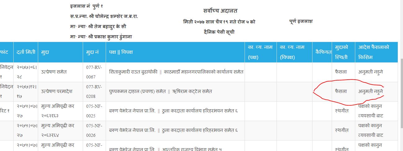 पूर्ण इजलासले निस्सा नदिएको सर्वोच्च अदालतका सहायक प्रवक्ता देवेन्द्र ढुंगानाले जानकारी दिए। यससँगै दाहालले दिएको मुद्दा पुनरावलोकन नहुने भएको हो।