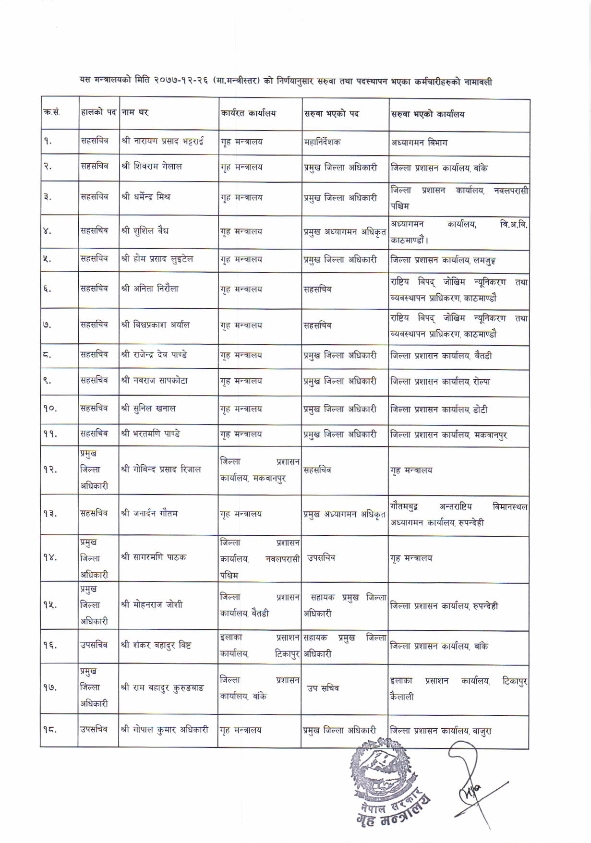 काठमाडौंः गृह मन्त्रालयले २६ जना उपसचिव तथा सहसचिवको सरुवा तथा पदस्थापन गरेको छ।