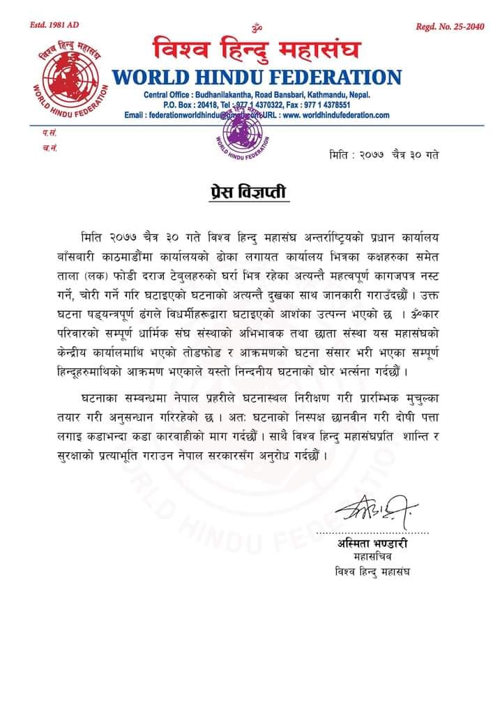 काठमाडौं : विश्व हिन्दु महासंघ अन्तर्राष्ट्रियको प्रधान कार्यालयबाट कागजपत्र चोरी भएको छ। काठमाडौंको बाँसबारीस्थित प्रधान कार्यालयबाट अत्यन्तै महत्वपूर्ण कागजपत्र नस्ट तथा चोरी गरिएको महासंघले जनाएको छ।