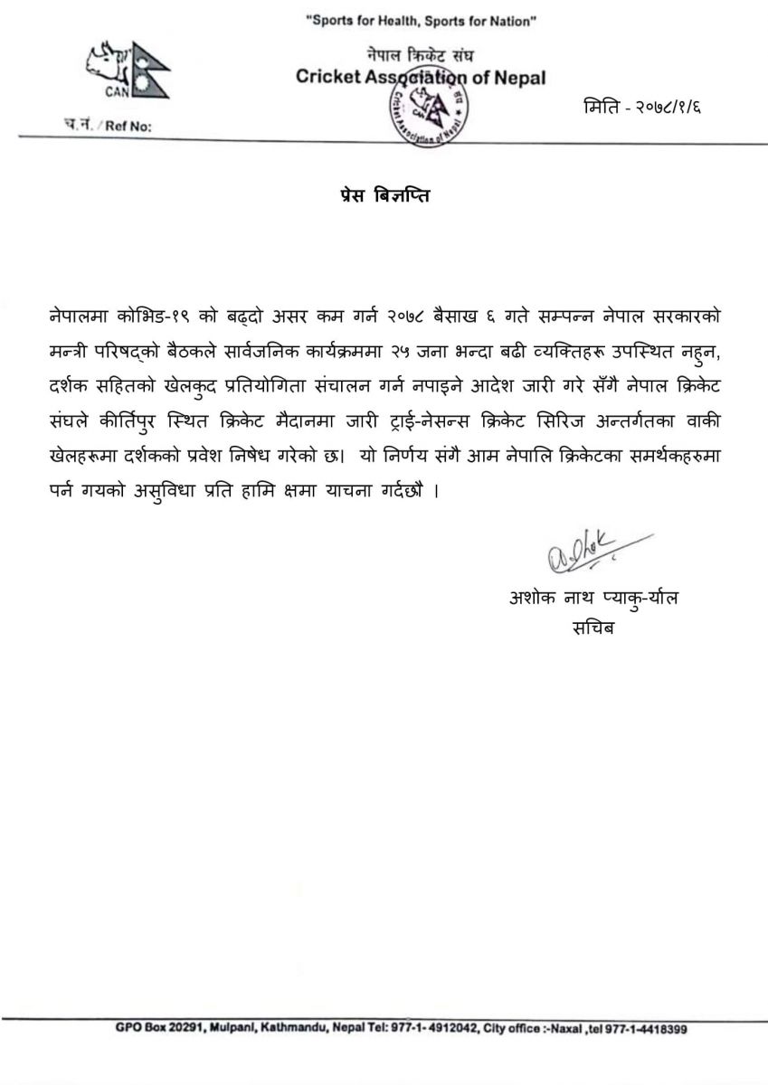 क्यानद्वारा जारी विज्ञप्तिमा भनिएको छ, ‘नेपाल क्रिकेट संघले कीर्तिपुरस्थित क्रिकेट मैदानमा जारी ट्राई-नेसन्स क्रिकेट सिरिज अन्तर्गतका बाँकी खेलहरूमा दर्शकको प्रवेश निषेध गरेको छ। यो निर्णयसँगै आम नेपाली क्रिकेटका समर्थकहरुमा पर्न गएको असुविधाप्रति हामी क्षमा याचना गर्दछौँ।’