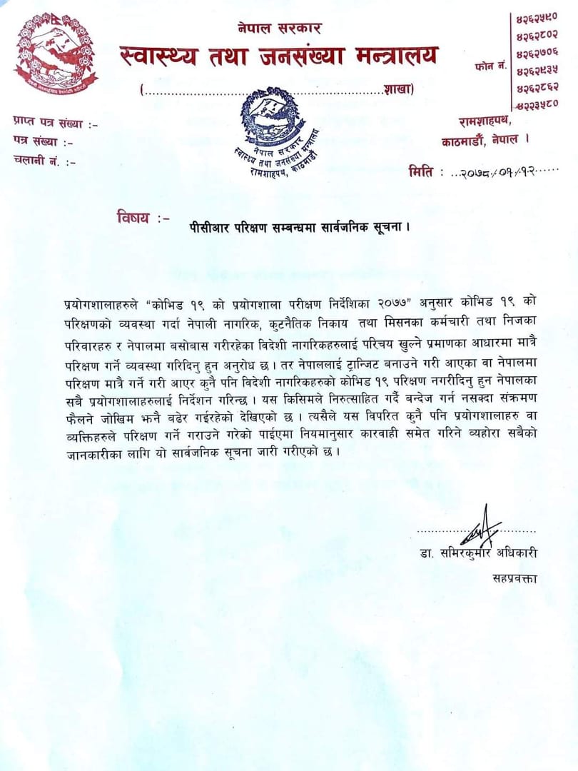 नेपाली नागरिक, कुटनैतिक निकाय तथा मिसनका कर्मचारी तथा उनीहरुका परिवार र नेपालमा बसोबास गरिरहेका विदेशी नागरिकको परिचय खुल्ने प्रमाणका आधारमा मात्रै कोभिड-१९ को परीक्षण गर्न अनुरोध समेत गरेको छ।