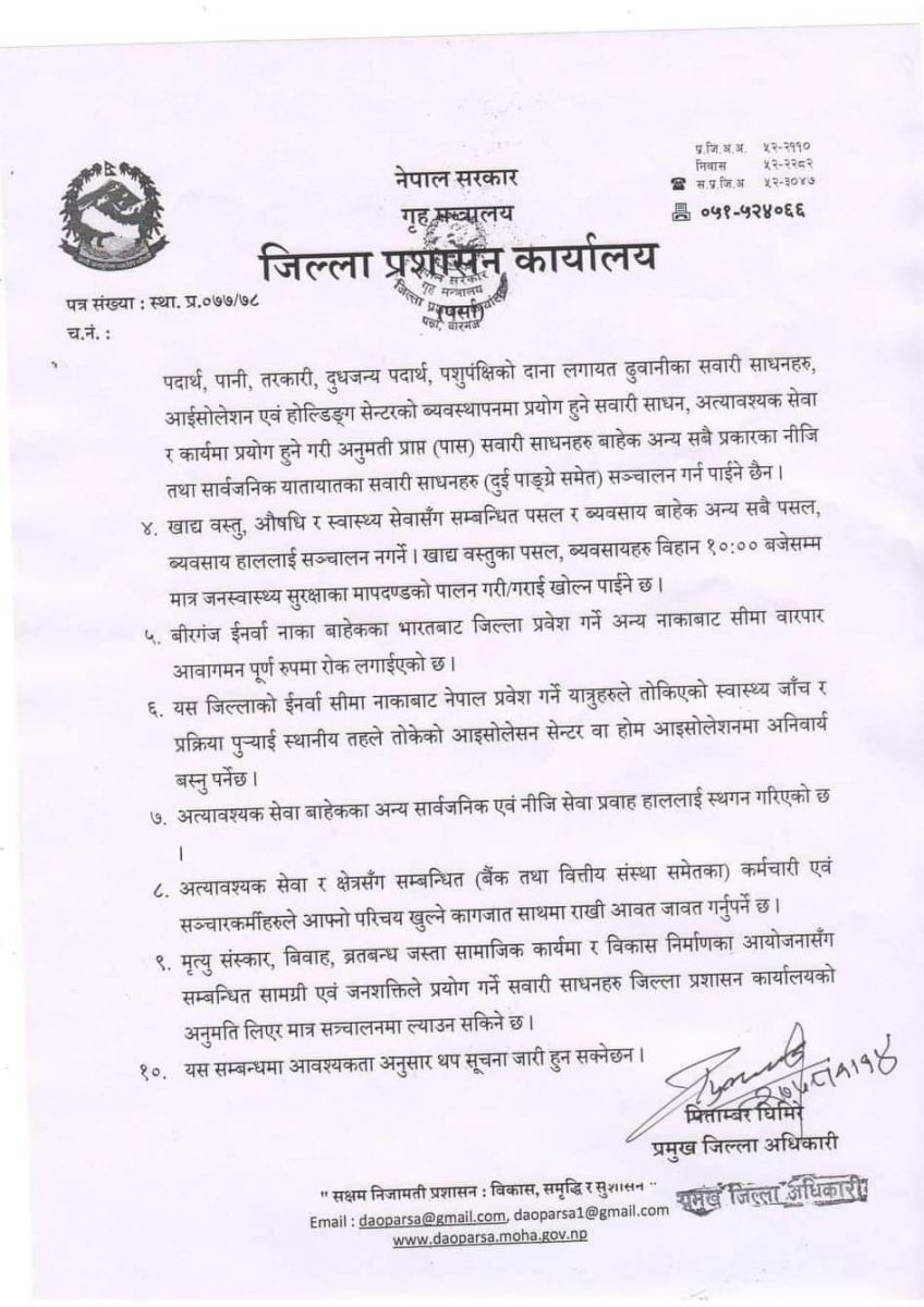 वीरगंज ईनर्वा नाका बाहेकका भारतबाट जिल्ला प्रवेश गर्ने अन्य नाकाबाट सीमा वारपार आवागमन पूर्ण रुपमा रोक लगाइएको बताइएको छ। पर्साको ईनर्वा सीमा नाकाबाट नेपाल प्रवेश गर्ने यात्रुहरुले तोकिएको स्वास्थ्य जाँच र प्रक्रिया पुऱ्याई स्थानीय तहले तोकेको आइसोलेसन सेन्टर वा होम आइसोलेसनमा अनिवार्य बस्नु पर्ने प्रशासनले भनेको छ।
