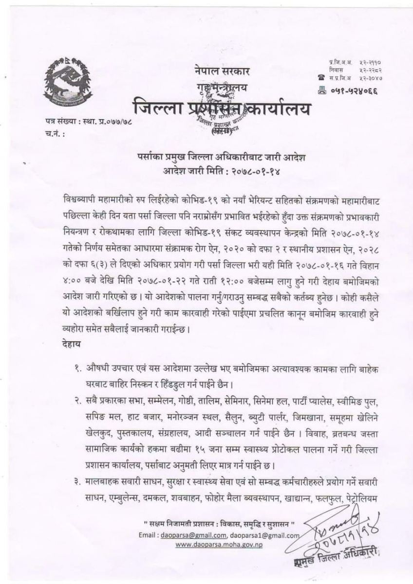 वीरगंज : जिल्ला प्रशासन कार्यालय पर्साले बैशाख १६ गते बिहान ४ बजेदेखि बैशाख २२ गते राति १२ बजेसम्म लागू हुने गरी निषेधाज्ञा जारी गरेको छ। कोभिड-१९ संक्रमणको प्रभावकारी नियन्त्रण र रोकथामका लागि निषेधाज्ञा जारी गरिएको प्रमुख जिल्ला अधिकारी पिताम्बर घिमिरेले जानकारी दिए।