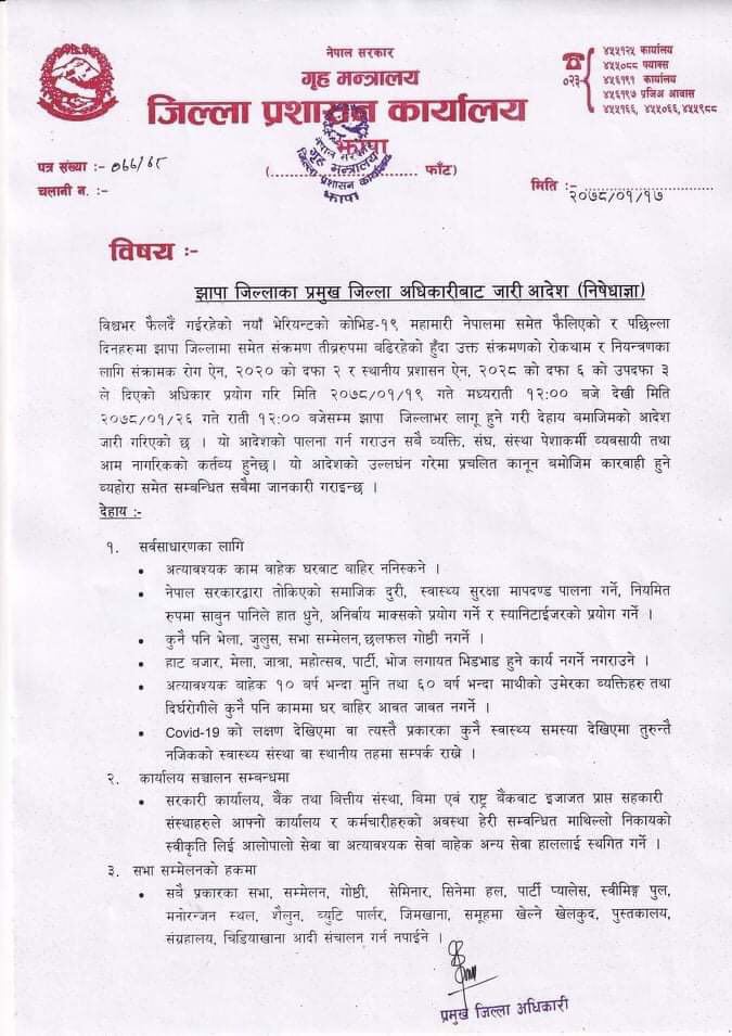 काठमाडौं : जिल्ला प्रशासन कार्यालय झापाले आइतवारदेखि लागू हुने गरी एक हप्ताको लागि जिल्लाभर निषेधाज्ञा जारी गरेको छ। कोभिड-१९ संकमण तीव्र रुपमा बढिरहेको भन्दै संक्रमणको रोकथाम र नियन्त्रण गर्न आइतवार मध्यराति १२ वजेदेखि २६ गते राति १२ वजेसम्मको लागि निषेधाज्ञा जारी गरेको हो।