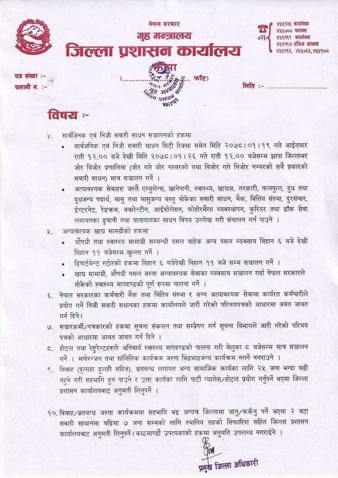 यसैगरी, प्रशासनले सरकारी कार्यालय, बैंक तथा वित्तीय संस्था, बिमा एवं राष्ट्र बैंकबाट इजाजत प्राप्त सहकारी संस्थाहरुले आफ्नो कार्यालय र कर्मचारीहरुको अवस्था हेरी सम्बन्धित माथिल्लो निकायको स्वीकृति लिई आलोपालो सेवा वा अत्यावश्यक सेवा बाहेक अन्य सेवा हाललाई स्थगित गर्न भनेको छ।