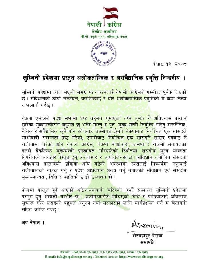 एक विज्ञप्ति जारी गर्दै सभापति देउवाले नेकपा एमालेले प्रदेश सभामा प्रष्ट बहुमत गुमाएको तथ्य बुझेर नै अविश्वास प्रस्ताव छलेका मुख्यमन्त्रीसँग बहुमत छ भनेर मान्नु र पुनः मुख्यमन्त्री नियुक्ति गरिनु राजनैतिक, नैतिक र संवैधानिक कुनै पनि कोणबाट तर्कसंगत नभएको बताएका छन्।