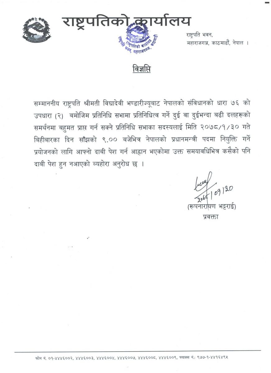 काठमाडौंः राष्ट्रपति कार्यालयले संविधानको धारा ७६(२) अनुसार गठबन्धन सरकारको प्रधानमन्त्रीका लागि कसैबाट पनि दाबी पेस नभएको जनाएको छ।