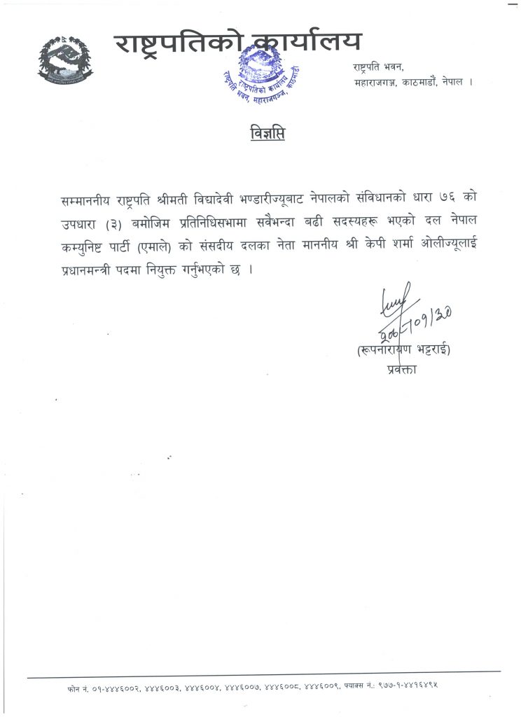 काठमाडौंः राष्ट्रपति विद्यादेवी भण्डारीले केपी शर्मा ओलीलाई पुनः प्रधानमन्त्रीमा नियुक्त गरेकी छन्। बहुमतीय सरकार गठनको प्रयास असफल भएपछि प्रतिनिधि सभाको ठूलो दलको संसदीय दलको नेताका हैसियतमा ओली पुनः प्रधानमन्त्री नियुक्त भएका हुन्।