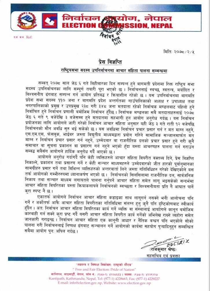 ‘निर्वाचनको सिलसिलामा राजनीतिक दल, सार्वजनिक निकाय तथा सञ्चार माध्यम लगायतले पालना गर्नुपर्ने आचार संहिता समेत लागू भइसकेको सन्दर्भमा आचार संहिता विपरीतका यस्ता क्रियाकलापले निर्वाचनको स्वच्छता र विश्वसनीयताप्रति नै आघात पार्ने कुरा स्पष्ट नै छ,’ आयोगले भनेको छ।