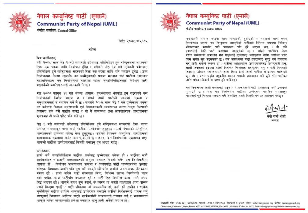 निर्वाचनमा नेकपा एमालेका तर्फबाट रामबहादुर थापा बादल उम्मेदवार छन् भने विपक्षी गठबन्धनबाट डा खिमलाल देवकोटा उम्मेदवार छन्।एमालेको माधव नेपाल समूहले आफैले विपक्षी गठबन्धनको उम्मेदवार बनाएकाले एमाले उम्मेदवार बादललाई मत दिन नसक्ने जनाएको छ।
