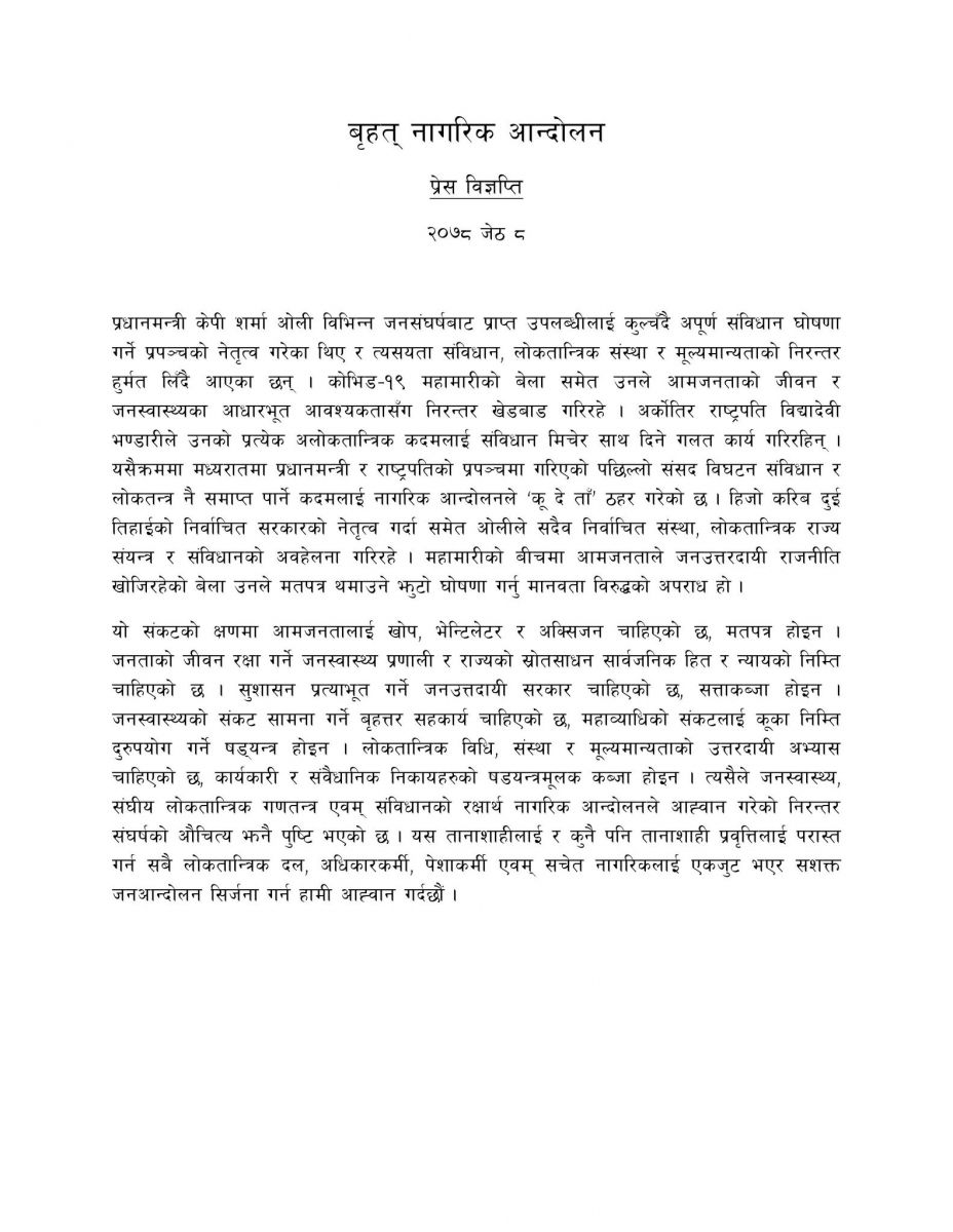 काठमाडौं : ‘वृहत नागरिक आन्दोलन’ले महामारीको बीचमा आमजनताले जनउत्तरदायी राजनीति खोजिरहेको बेला मतपत्र थमाउने झुटो घोषणा गर्नु मानवता विरुद्धको अपराध भएको बताएको छ। ‘वृहत नागरिक आन्दोलन’ले विज्ञप्ति जारी गर्दै मध्यरातमा प्रधानमन्त्री केपी ओली र राष्ट्रपति विद्यादेवी भण्डारीको संसद विघटन, संविधान र लोकतन्त्र नै समाप्त पार्ने कदमलाई ‘कू दे ताँ’ ठहर गरेको बताएको छ।