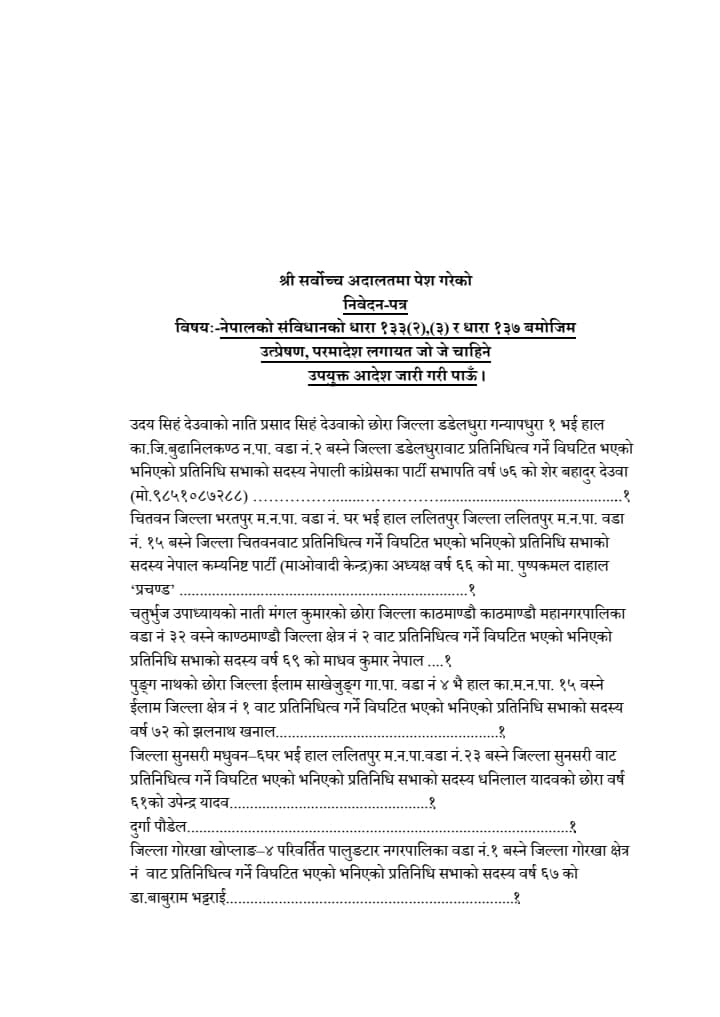 प्रतिनिधिसभा विघटन बदर र प्रतिपक्षी नेता देउवालाई प्रधानमन्त्री बनाउन ७ वटासम्म परमादेश र उत्प्रेषणको आदेश माग गरिएको रिटमा १४६ नाम सूचीमा हेर्न सकिन्छ।
