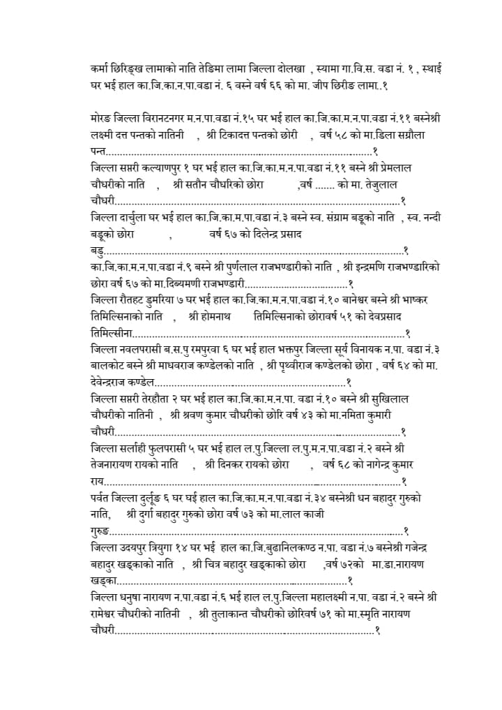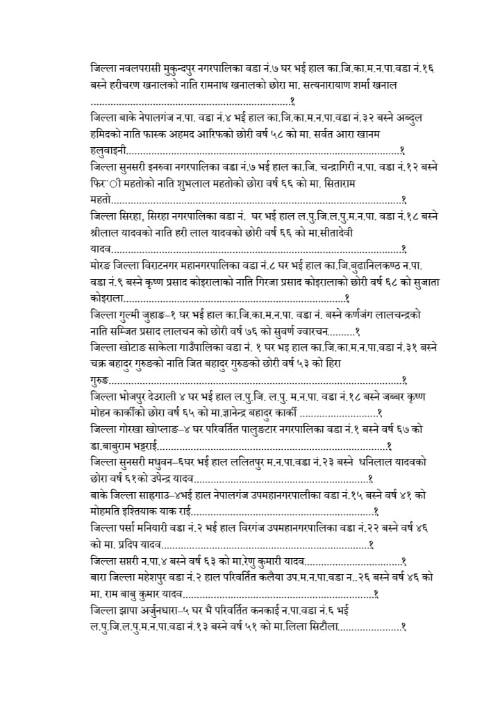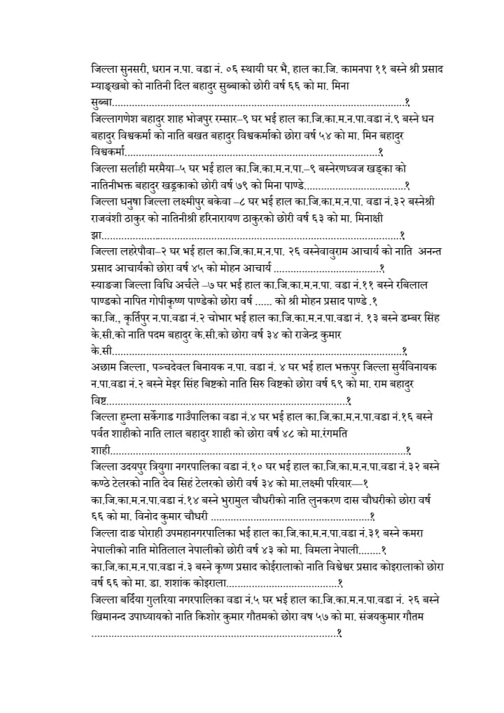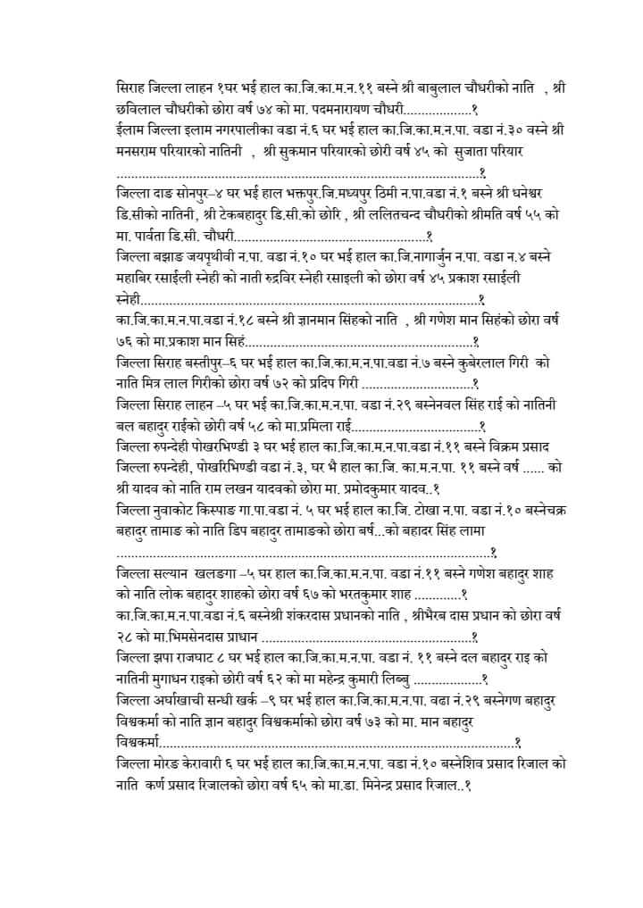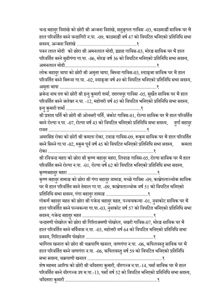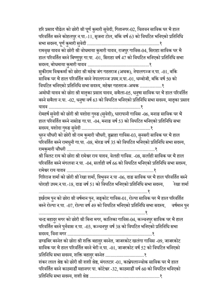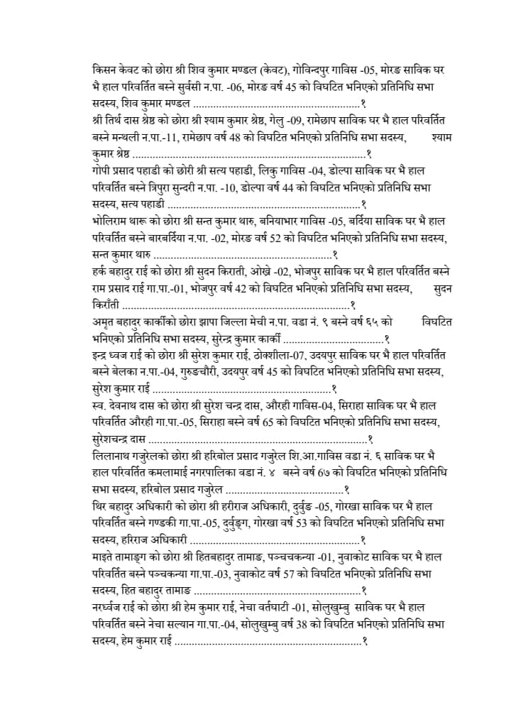 रिट निवेदकमा १ नम्बरमा शेरबहादुर देउवाको नाम छ। उनको उमेर ७६ वर्ष रहेको छ। दोस्रो नम्बरमा पुष्पकमल दाहाल प्रचण्डको नाम छ। उनी ६६ वर्षका हुन्। तेस्रो नम्बरमा माधवकुमार नेपालको नाम छ। उनको उमेर ६९ वर्ष उल्लेख छ। चौथो नम्बरमा नाम रहेका झलनाथ खनालको उमेर ७२ वर्ष छ। पाँचौ नम्बरमा रहेका उपेन्द्र यादवको उमेर वर्ष ६१ र छैठौं नम्बरमा रहेकी दुर्गा पौडेलको ठेगाना र उमेर खुलाइएको छैन भने सातौं नम्बरमा ६७ वर्षीय बाबुराम भट्टराईको नाम छ।
