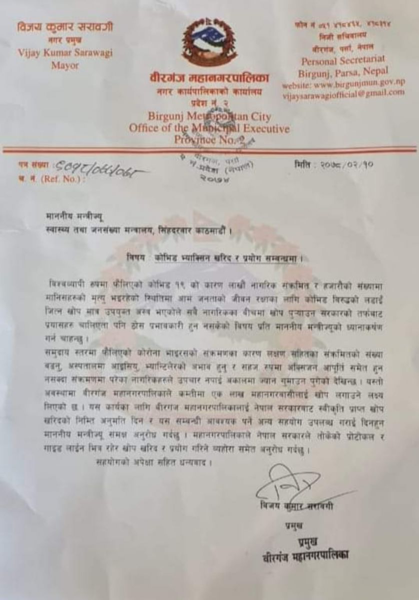 ‘केन्द्र सरकारको मुख ताकियो भने समयमा खोप लगाउन सकिदैन’, उनले भने, ‘त्यसैले आफैँ खोप किनेर जनतालाई लगाउन महानगरले कदम चालेको छ, यस बारेमा संघीय सरकारको स्वास्थ्य तथा जनसंख्या मन्त्रालयसँग अनुमति माग गरिएको छ।’