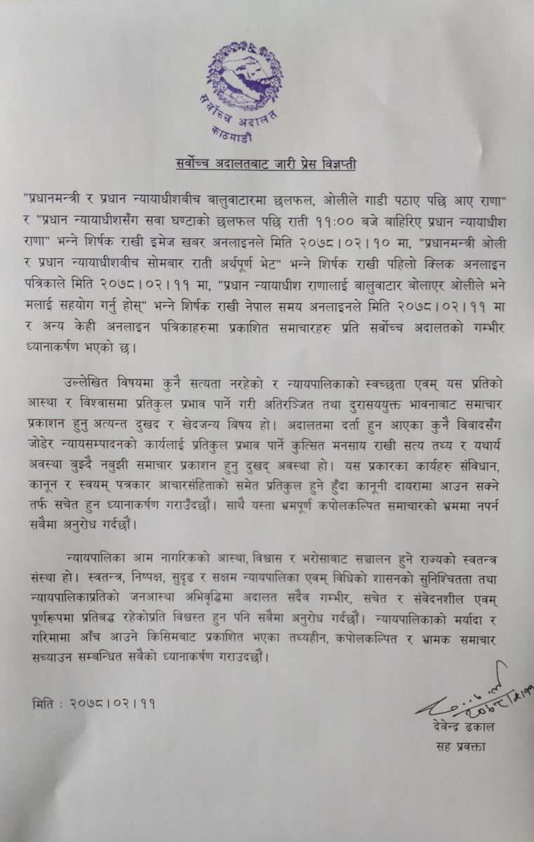 काठमाडौं : प्रधानमन्त्री केपी शर्मा ओली र प्रधान न्यायाधीश चोलेन्द्र शम्शेर जबराबिच सोमवार राति भेट भएको भन्दै केही मिडियामा प्रकाशित समाचारलाई लिएर सर्वोच्च अदालतले न्याय सम्पादनमा प्रतिकूल प्रभाव पार्ने मनाशय रहेको भन्दै ध्यानाकर्षण गराएको छ।